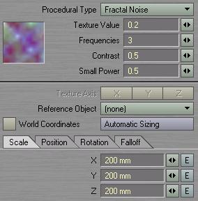 We want these things to move and using procedural textures to do this works great! Use a procedural fractal noise with defaults but change the scale to 200mm on each axis. Click envelope for the rotational value of the bank for the texture. Add a key at frame 2160 with a value of 360 degrees. This will make the texture rotate in 3D space at 6 frames per degree of rotation. Set your timeline length to a few hundred frames and you'll see your particles (may need them selected) moving about in a random pattern which now need to interact with each other. |