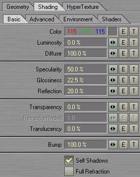 Select your cube points and activate them as hypervoxel particles. Set the object type to surface. Set the particle size to 130 mm. Size Variation to 200 % Choose your object color and surface settings. I used the settings shown to the left. On the environment tab, set to spherical reflection map and choose your favorite seamless reflection image. I used a water reflection image. |